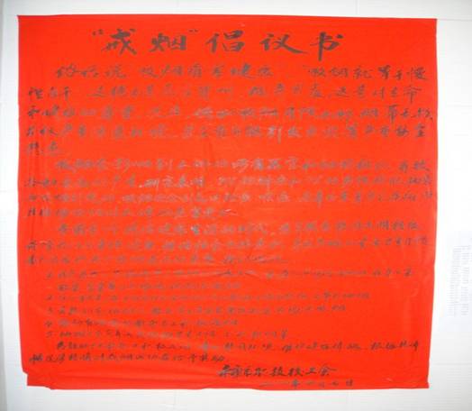 在三楼教师餐厅的墙上我们还看到工会张贴的戒烟倡议书,倡议在公共场所不要吸烟。