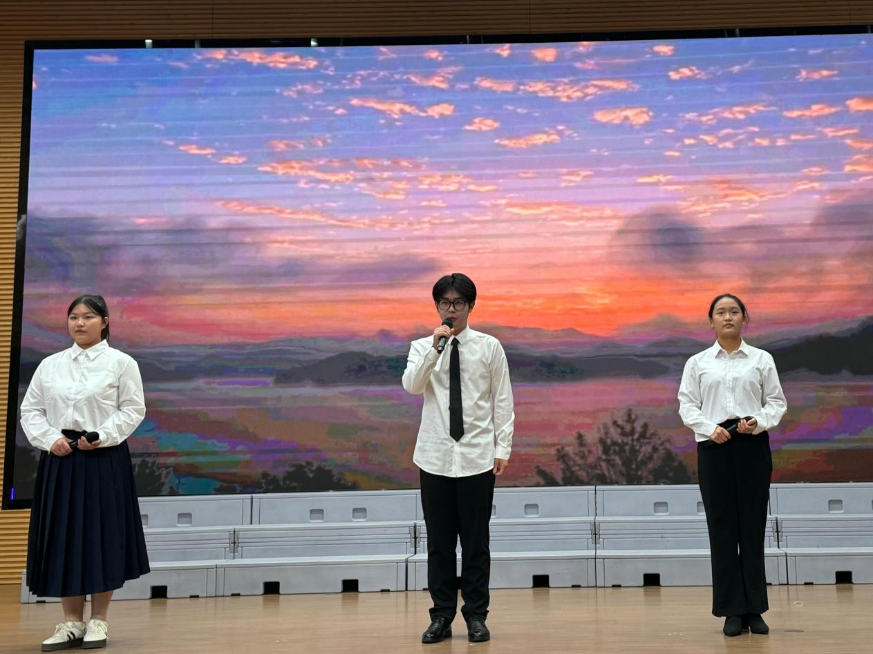 舞台上,学校参赛队员们精神饱满、气韵生动。他们以声传情,以情动人,温润的嗓音款款流淌,时而如江河奔涌气势磅礴,时而似溪涧低吟沁人心脾。他们自信从容的台风与作品意境浑然一体,掀起观众心中“万丈波澜”,完美演绎了作品的身后内涵与时代精神,充分展现了我校学子昂扬向上的精神风貌和良好的文化素养。