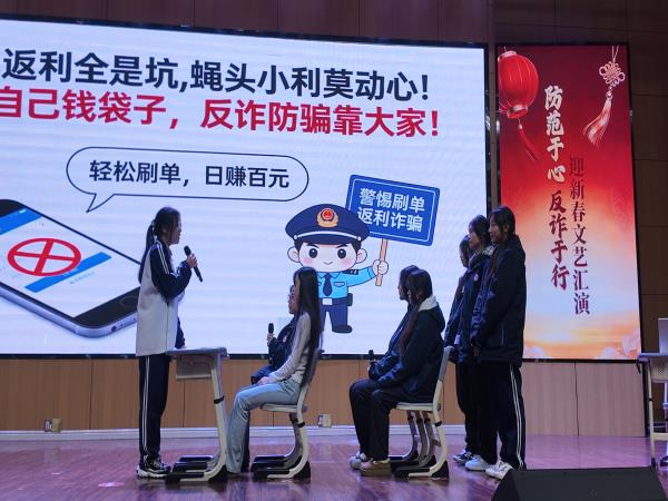 本次文艺汇演形式多样、内容丰富,涵盖 PPT 宣讲、情景剧、朗诵、演唱、竹板表演、小品等多种艺术形式,各班级学子们以生动鲜活的演绎,将电信诈骗的常见手段与防范技巧融入精彩节目中。24工艺美术班的王梓璇、夏明涵等同学带来 PPT 宣讲《防范于心 反诈于行》直观呈现诈骗危害;24 对口旅游班的情景剧《“守护钱袋子”计划》、24 对口护理班的《刷单陷阱 - 我的 “高新” 兼职梦碎》等节目,还原了刷单返利、虚假兼职等典型诈骗场景;24 对口农艺班吕葛欣的朗诵《守护钱袋,擦亮双眼》、24 对口会计 2 班的小品《谨防 AI 换脸,守护财产安全》,分别从语言感染力和现实警示性角度,提醒同学们警惕新型诈骗手段;此外,《光阴的故事》《青花瓷反诈版》《反诈歌曲〈爱你〉》等演唱节目,以喜闻乐见的方式传递反诈理念,竹板表演《刷单陷阱》则凭借独特的艺术表现形式,让反诈知识入脑入心。24 对口电子班的情景剧《骗你一个亿》、24 创新机电 1 班的小品《骗子竟在我身边》等节目也各具特色,赢得现场阵阵掌声。