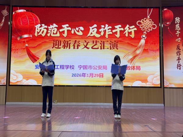 为切实提升学生防范电信网络诈骗的意识和能力,筑牢校园安全防线,2026 年 1 月 29 日下午,安徽材料工程学校(宁国市技工学校)基础部 24 级在树人报告厅隆重举办 “防范于心 反诈于行” 预防电信诈骗文艺汇演。宁国市教体局法安科副科长张乐、宁国市公安局反诈中心民警徐雅玲、学生处副主任薛刚、基础部副主任黄培培及 24 级全体班主任与学生共同参与了此次活动。