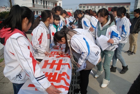为进一步贯彻落实省教育厅等三部门《关于进一步加强学校和职业培训机构预防艾滋病教育工作的通知》(皖教秘【2014】40号)文件要求,在全校普及预防艾滋病有关知识,增强学生的自我保护和自律意识,2014年3月5日,安徽材料工程学校学生处组织全校学生在宁职大道上开展了“携手遏制艾滋病,共建和谐社会”的预防艾滋病签名活动。