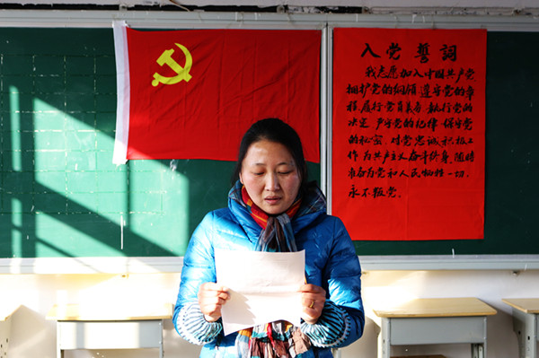 宣誓会场庄重而简朴,主席台前正中挂着鲜红的党旗和《入党誓词》。支部曹锋平书记首先简要介绍吕芳同志的个人事迹,在雄壮的国歌声中宣誓正式开始。预备党员吕芳在支部委员李红亮的领誓下,进行慷慨宣誓:“我志愿加入中国共产党……”,宣誓结束后,吕芳同志向党组织做表决心讲话。