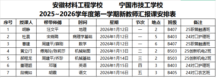 上一条:安徽材料工程学校2025~2026学年度第一学期教师公开课安排表(1.12-1.16)