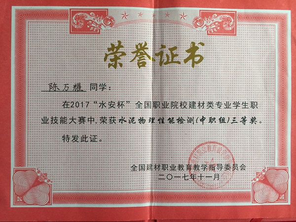 11月4日-11月7日,我校材料工程部选派的两只代表队参加了2017年“水安杯”全国职业院校建材类专业学生职业技能比赛。经过紧张的理论考试和激烈的实操竞争后,选手们共同为我校争取到团体三等奖的好成绩,陈万耀同学更是凭借扎实的理论和娴熟的操作获得了全国个人三等奖。