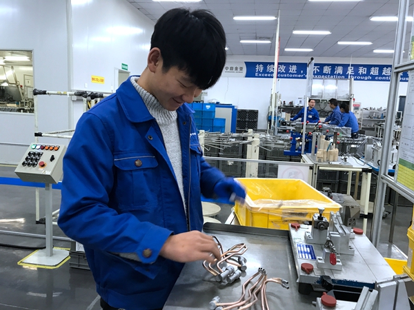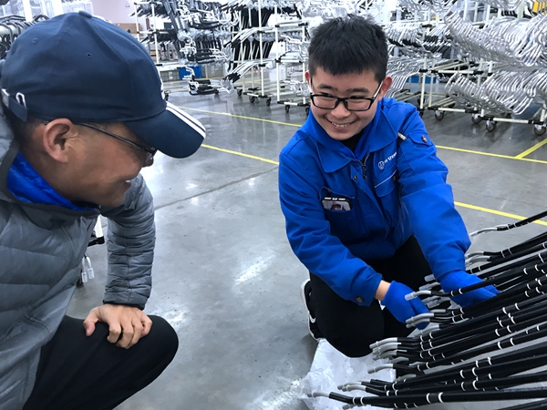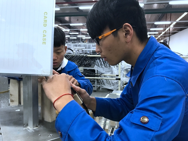 在企业负责人的陪同下,吴彬走进工厂车间,看望正在不同生产线上工作的学生。车间内部环境舒适、卫生,无噪音、污染小,他挨个走到他们的身边,亲切询问他们的工作情况,关心其住宿条件,鼓励其踏踏实实地干,坚持到底就是胜利。学生一天上8个小时白班,主要是将管件上的小部件进行组装、加工,虽然这些操作过程简单、快捷,却很好地锻炼了他们的耐心和毅力。