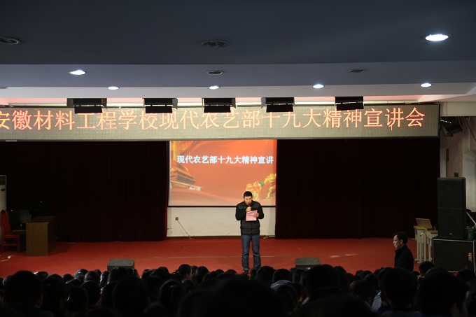 12月8日下午,安徽材料工程学校现代农艺部在报告厅举行十九大精神学生专场宣讲会,宣讲会由学校党委副书记、副校长魏先龙主讲,现代农艺部主任倪金江、副主任夏贤伟、班主任和农艺部四百五十余名学生参加了本次宣讲会。