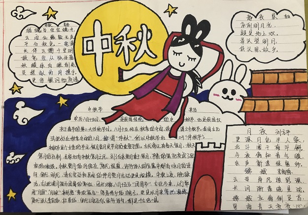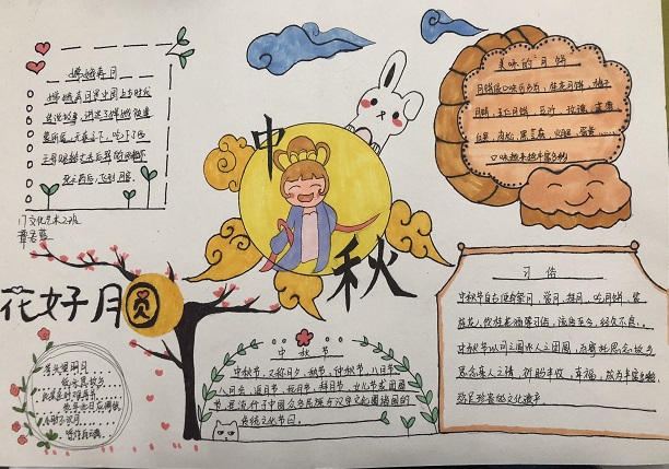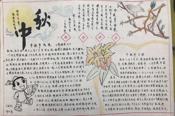 通过组织手抄报活动,同学们纷纷查阅资料一起追溯中秋节、国庆节的由来,了解了有关中秋节的故事,还知道了中秋节不同地区的民风习俗。让同学们进一步的感受到了传统节日带给我们的文化内涵,体验了我国传统节日的独特魅力,更是激发了学生的民族自豪感和爱国热情。