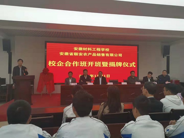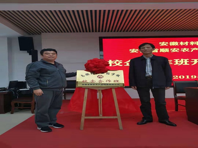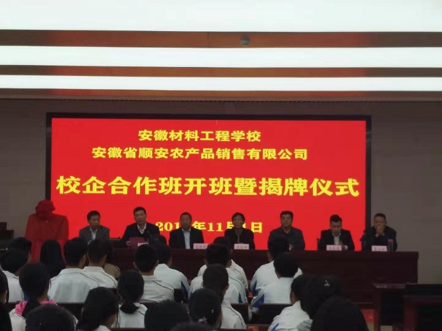 2019年11月1日上午,安徽材料工程学校与安徽省顺安农产品销售有限公司在图书馆一楼举行了校企合作开班暨揭牌仪式。